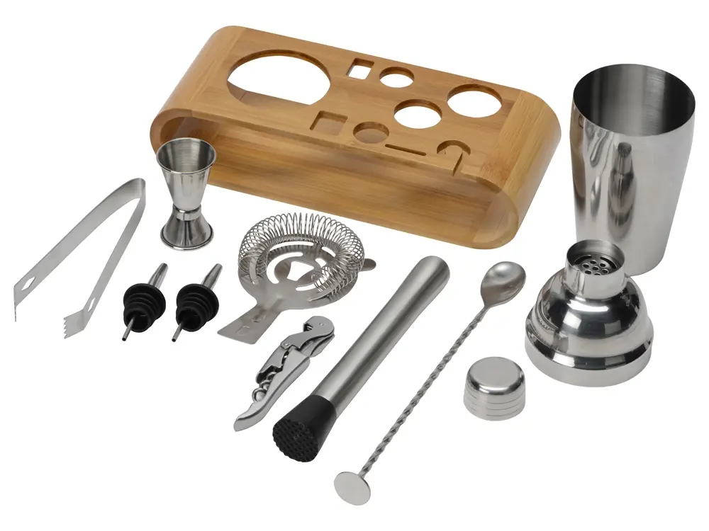 • Комплектность бамбуковая подставка- 27,3 х 10,6 х 6,6 см, барная ложка, джиггер 15/30 мл, гейзер -2 шт, мадлер, штопор, стрейнер, щипцы для льда, шейкер 550 мл