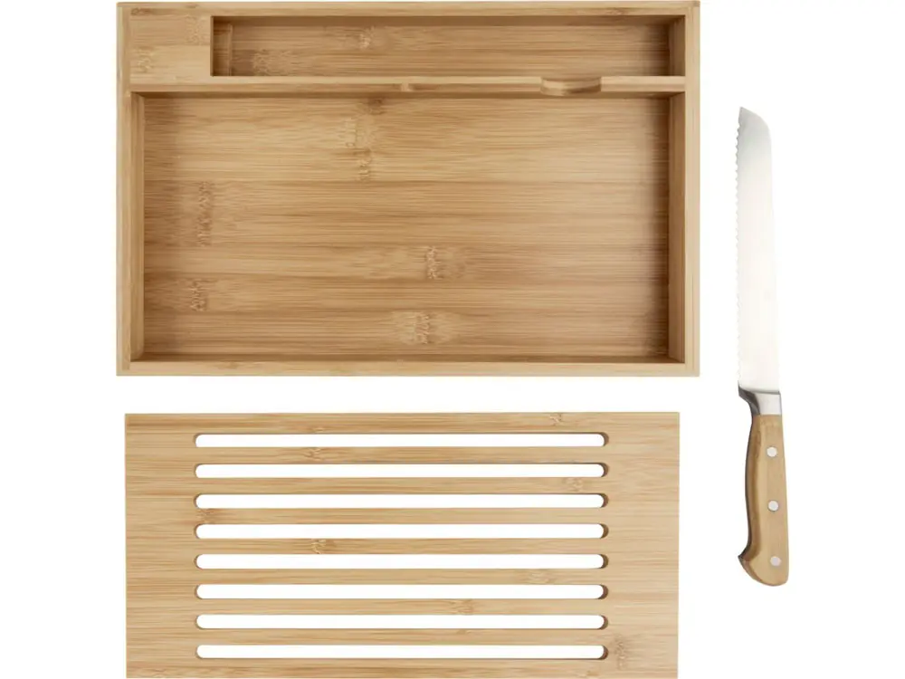 - Комплектность разделочная доска с поддоном 38 х 25 х 3 см, нож хлебный 34 х 3 см