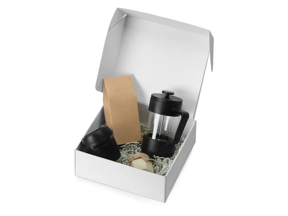 Цвет: френч-пресс- прозрачный/черный, стеклянный стакан- прозрачный/черный, упаковка кофе- крафт, бумажный наполнитель- серый