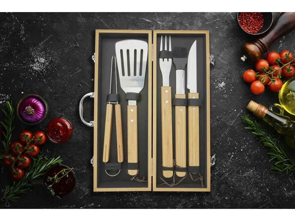 - Комплектность лопатка 40 x 9,5 см, щипцы 34,5 x 6 см, вилка 38,5 x 3 см, нож 38,5 x 3 см, щетка (38 x 4,3 см