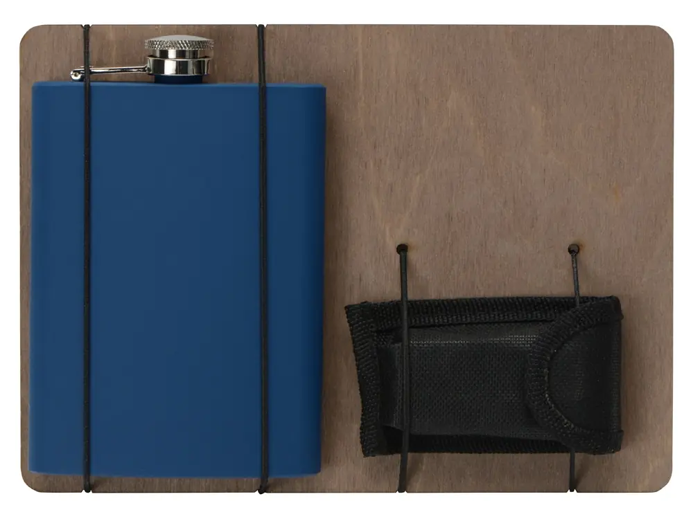 - Комплектность фляжка 240 мл 9,2 х 2,1 х 13,8 см, мультиинструмент 7 х 3,2 х 1,8 см, ложемент из фанеры 20,8 х 15 х 0,6 см