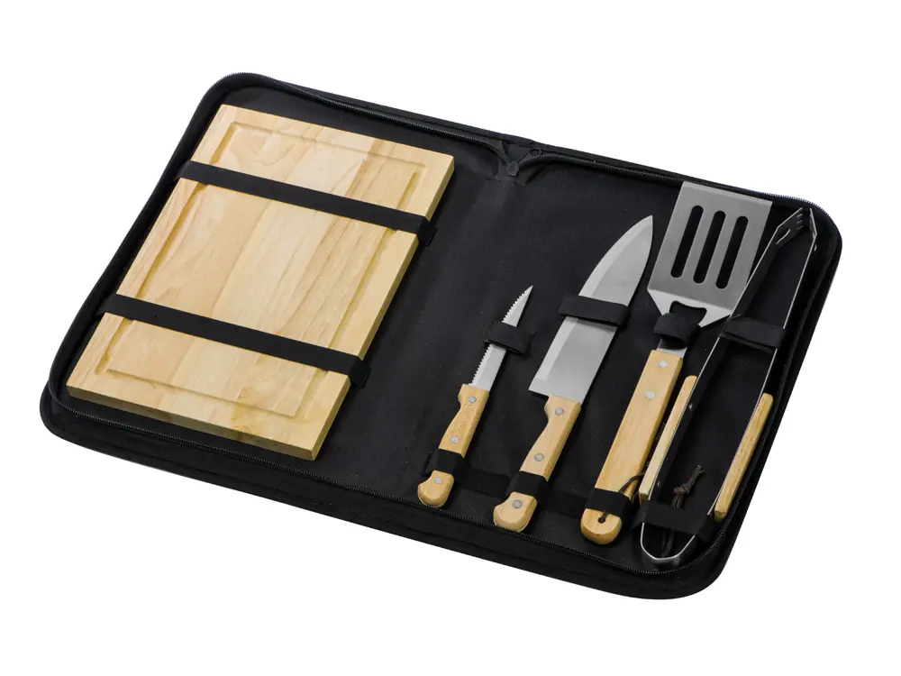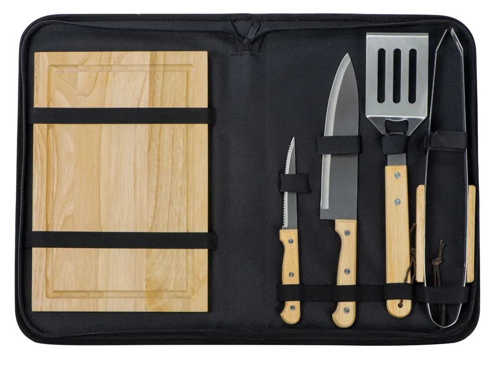- Комплектность разделочная доска 20 х 30 см, щипцы 34,5 см, лопатка 32,5 см, нож для стейка 21,5 см, нож большой 31,5 см, чехол из полиэстера 38,5 х 4,5 х 24,8 см
