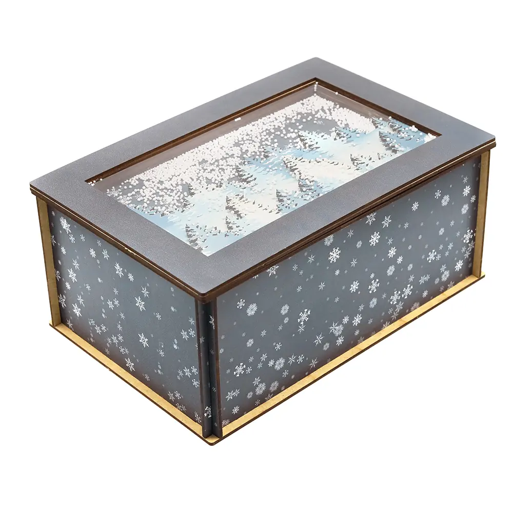 Лес в снегу (прямоугольная, темная) - упаковка новогодняя из дерева