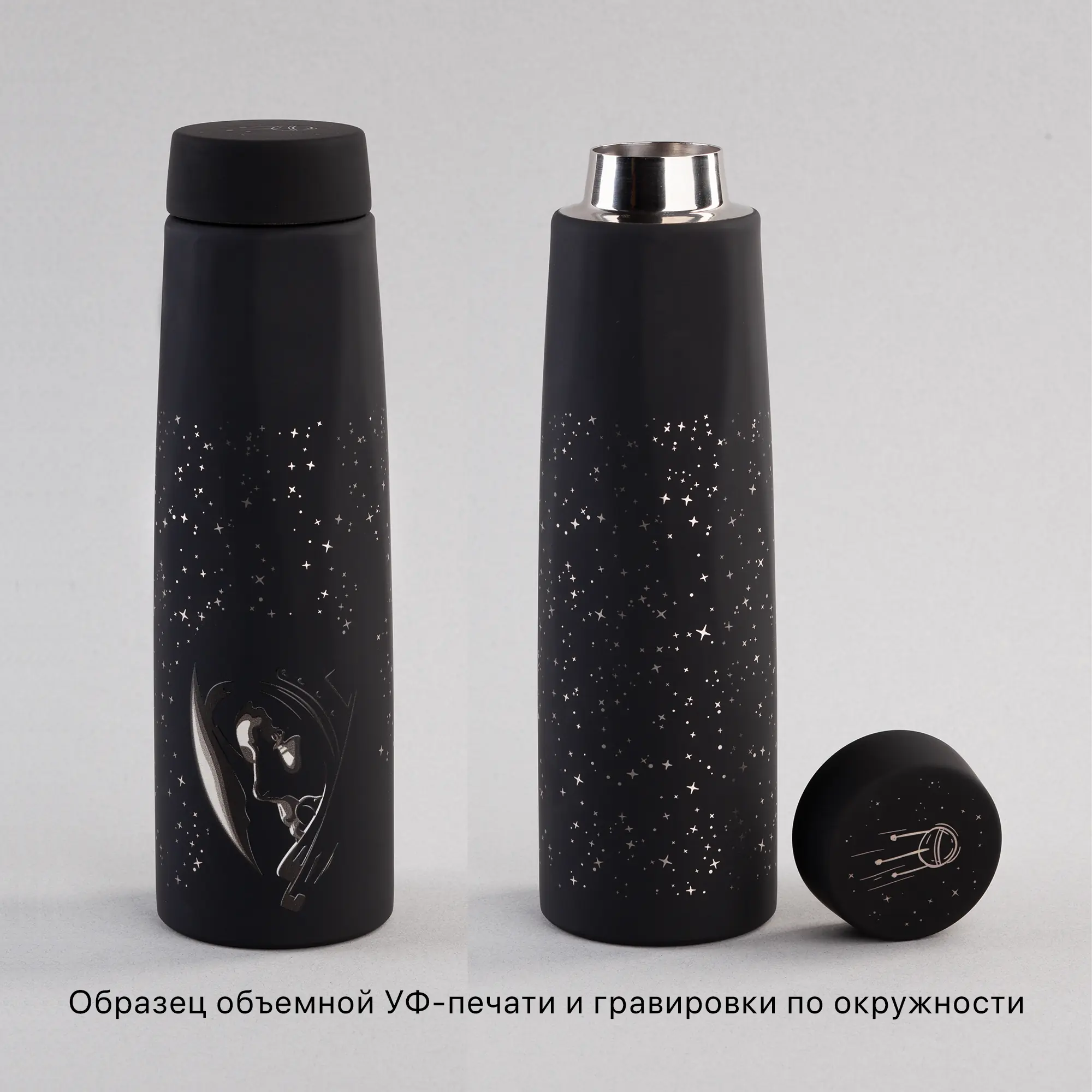 - OCEAN plottings:Крышка термоса сверху:LZ:"Зеркальная" гравировка газовым лазером, UF: Объемная УФ печать на плоскости