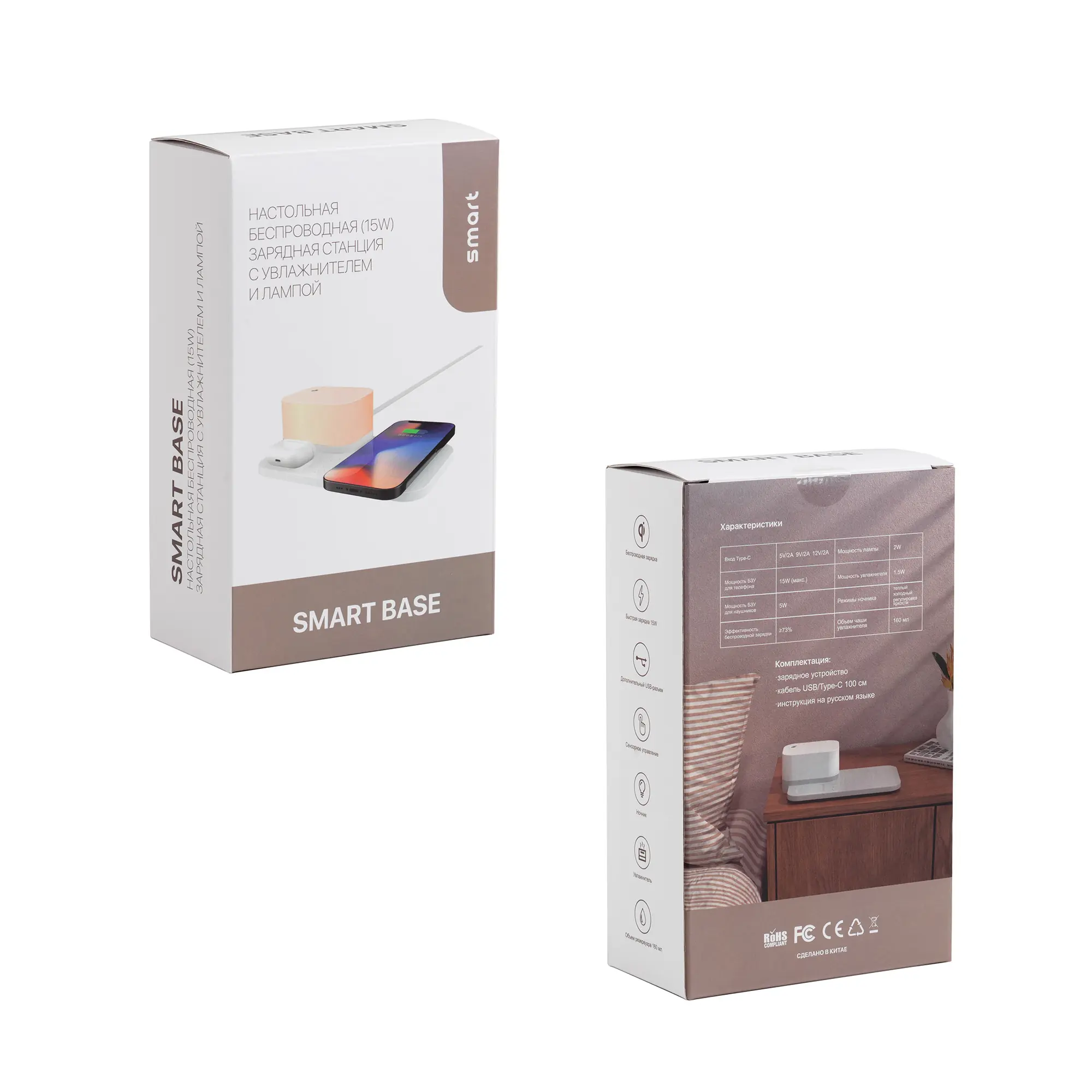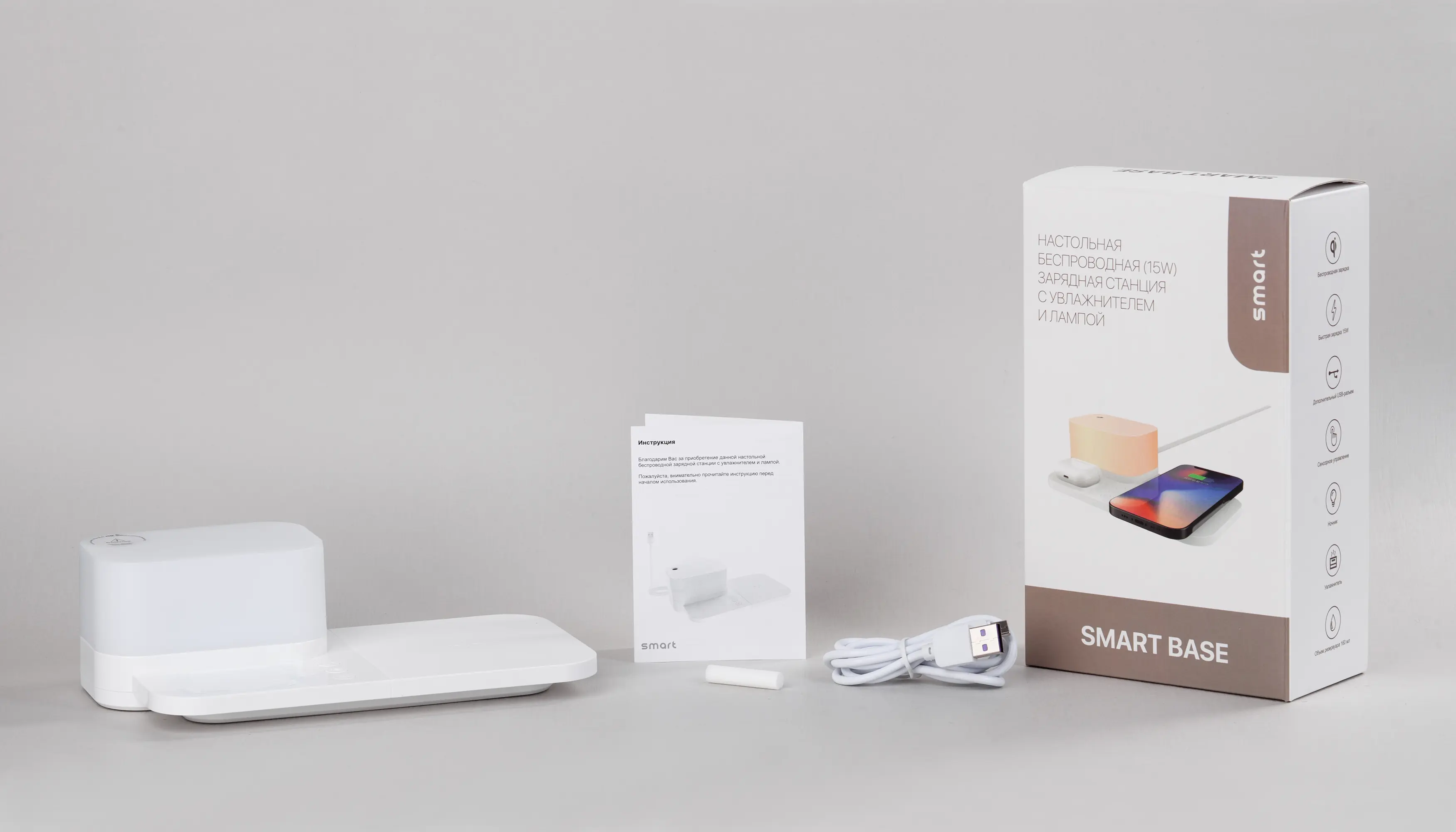 Настольная беспроводная (15W) зарядная станция "Smart Base" с увлажнителем и лампой / белый