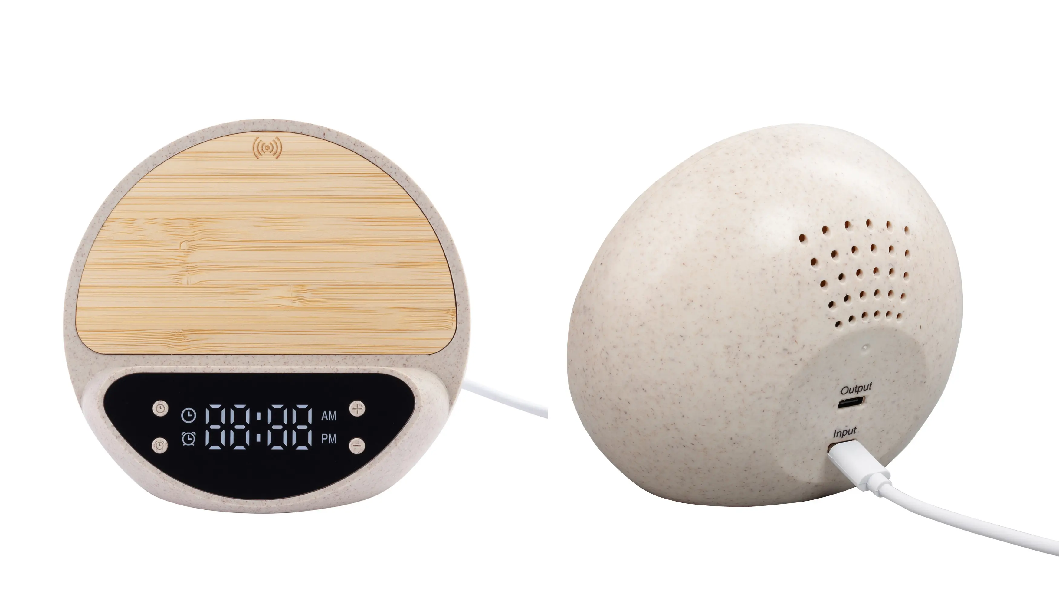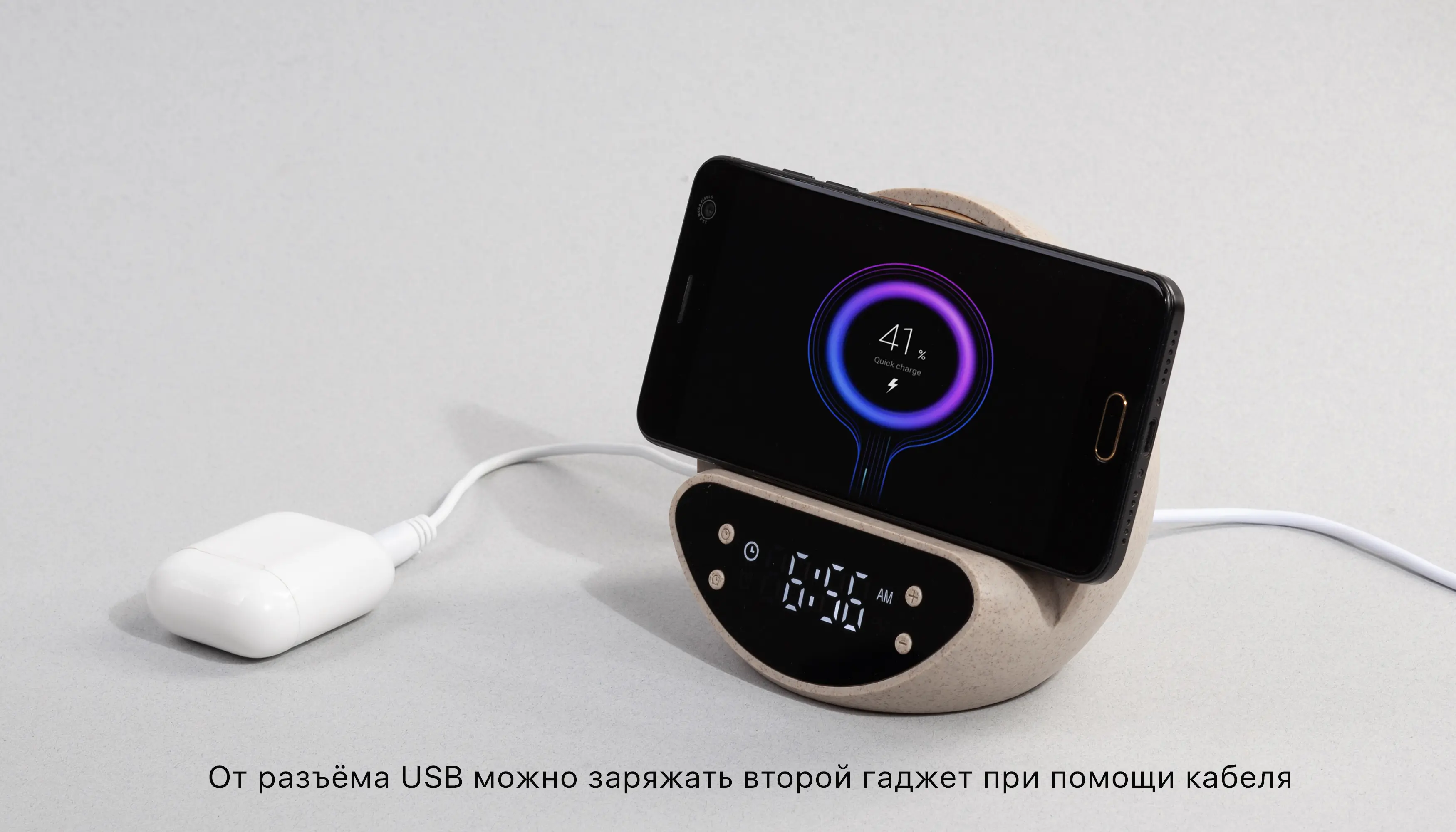 Настольные часы "Smiley" с беспроводным (10W) зарядным устройством и будильником, пшеница/бамбук/пластик / бежевый