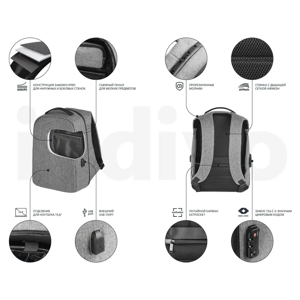 Рюкзак с потайным карманом inGreed, серый
