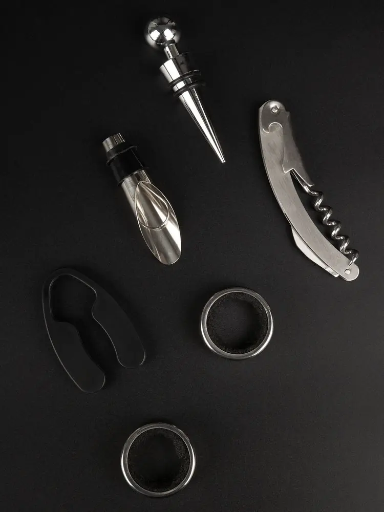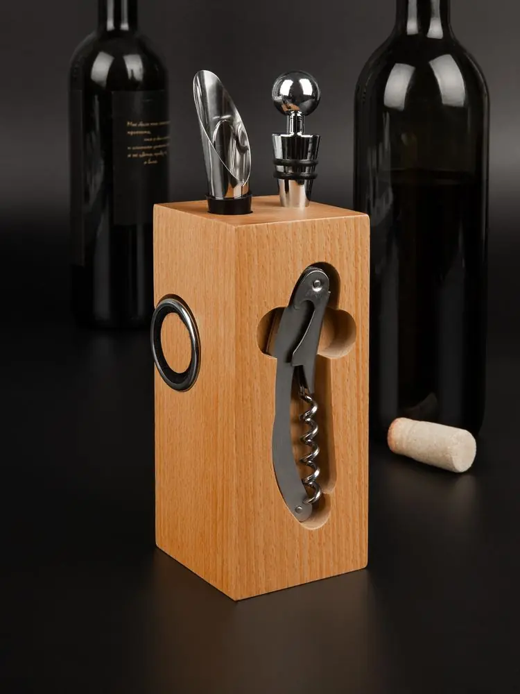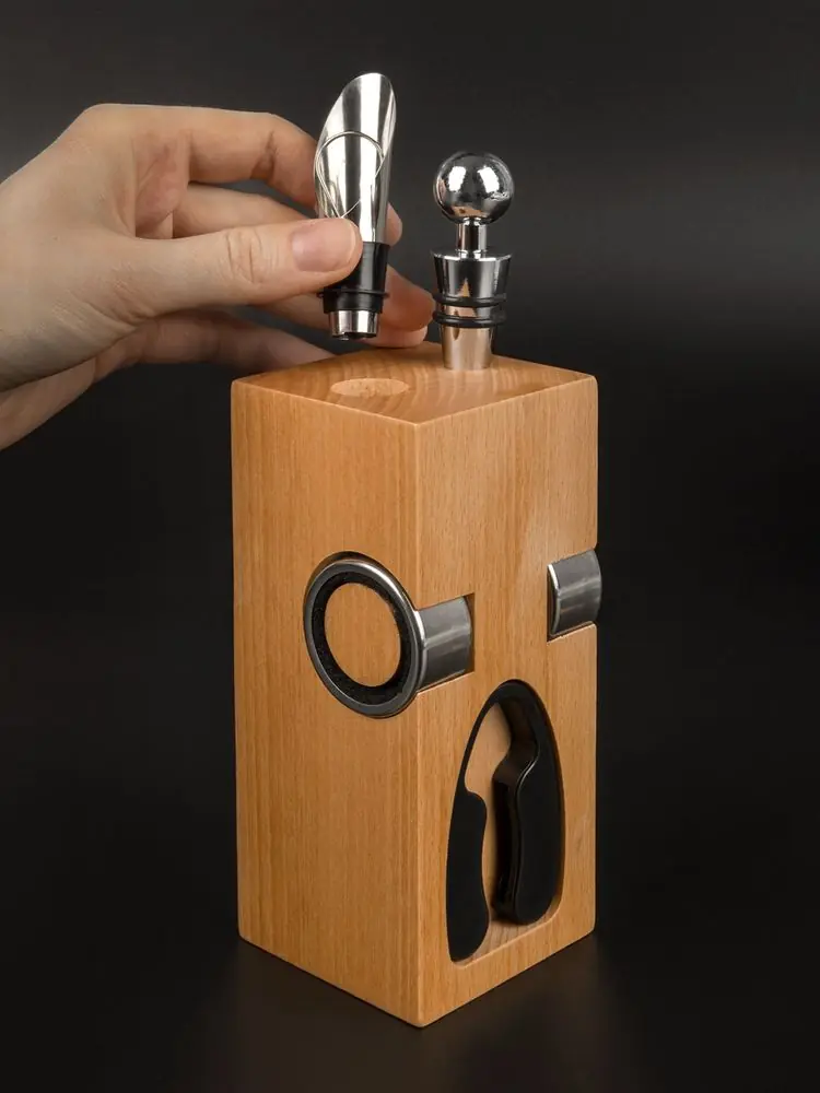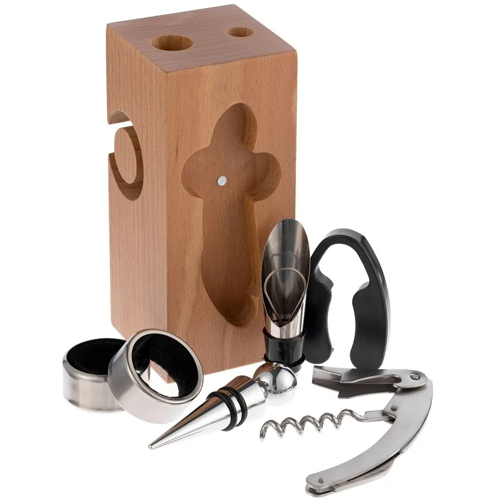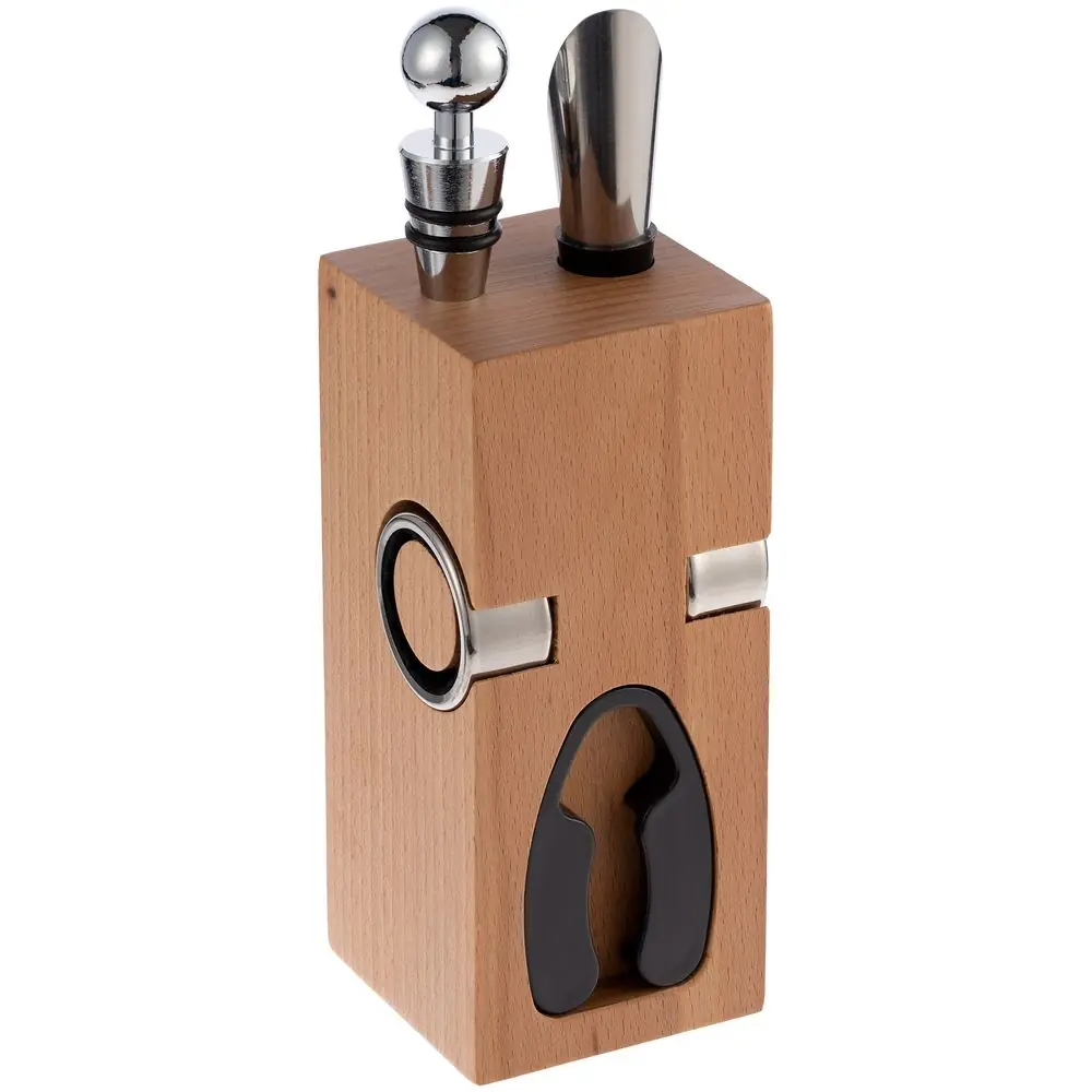 • Материал подставка - дерево, бук; штопор - нержавеющая сталь; каплеуловитель - нержавеющая сталь; аэратор - нержавеющая сталь, силикон; пробка - нержавеющая сталь, силикон; нож для фольги - пластик, нержавеющая сталь