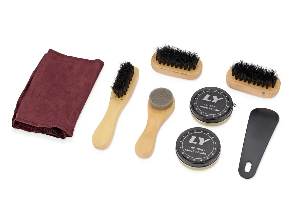 - Комплектность черный крем, бесцветный крем, 1 губка, 3 щетки, ложка для обуви, салфетка