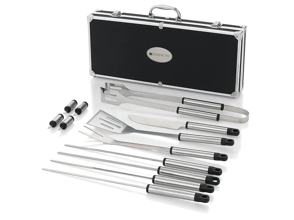 - Комплектность 4 шампура, 4 шпажки для снятия шашлыка, нож, щипцы, вилка и лопатка